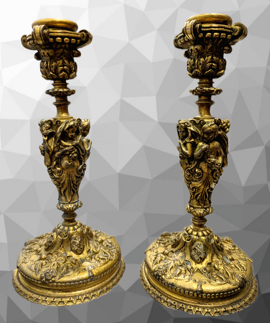 Antique French 19th Century Gilt Bronze Four Seasons Cherub Candlestick Holders