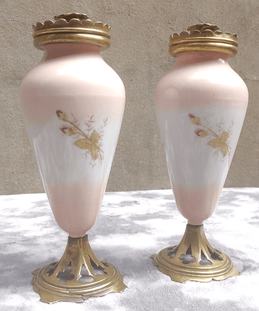 Antique Pair of 19th Century William Tonks & Sons Brass Ceramic Candlestick Holders