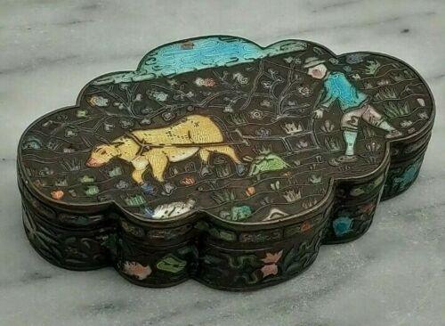 Antique Chinese Export Cloisonne Enamel Silvered Copper Opium Box Ox & Symbols