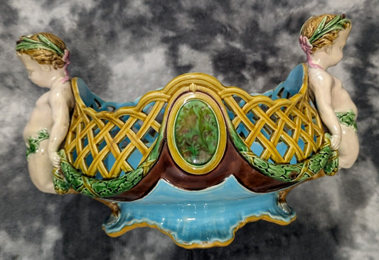 Rare Mintons Majolica Carrier-Belleuse Lattice Basket Faun 19th Century Antique Ceramic