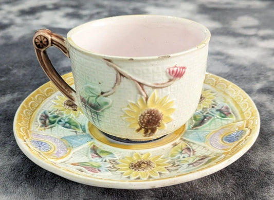 Victorian Aesthetic Movement Majolica Sunflower Urn Samuel Lear Teacup and Saucer Antique 19th Century