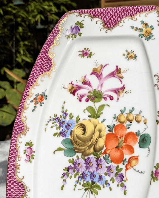 Antique German Dresden Hand Painted Floral Porcelain Plate Tray Platter - 28 cm