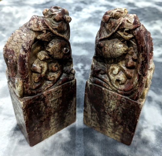 Large Pair of Antique Chinese Fire-breathing Dragon Carved Soapstone Qing Seals