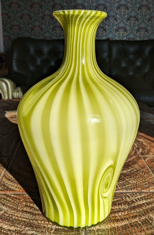 Large Vintage Green & White Striped Swirl Art Glass Vase 20th Century 40 cm