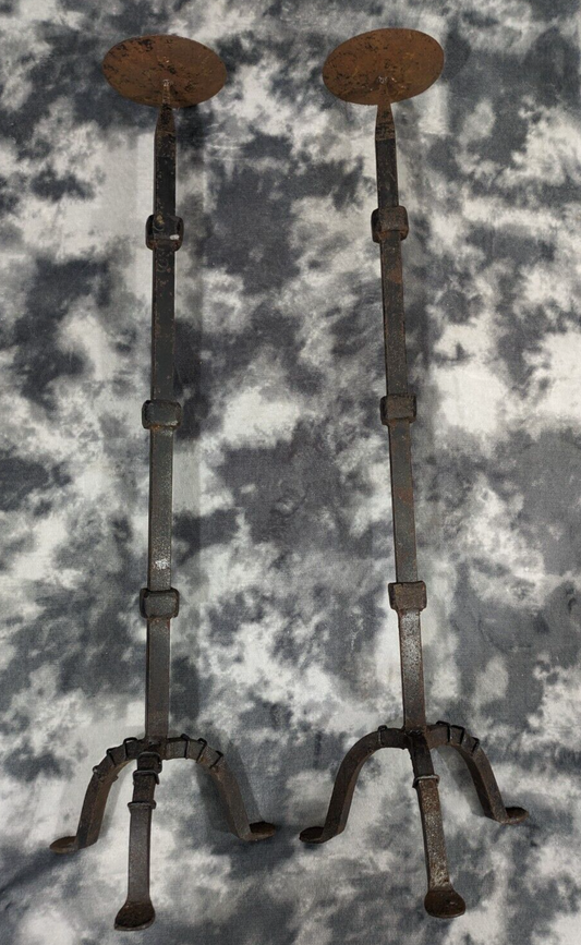 Antique Pair of Wrought Iron Arts & Crafts Standing Pricket Candle Stick Holders