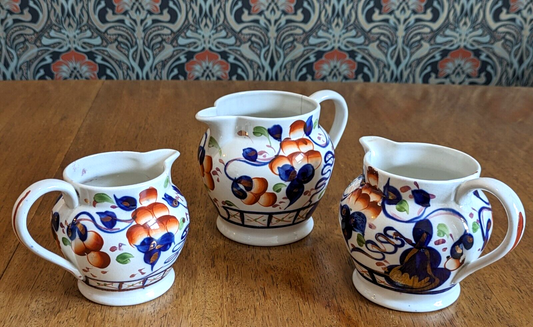 Antique Graduated Trio of Gaudy Welsh Imari Pitcher Jugs Vase Allertons England