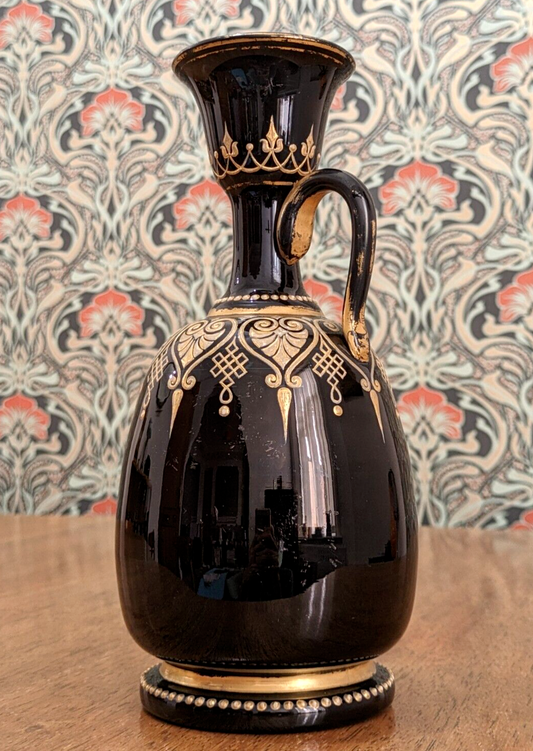 19th Century Black Bohemian Czech Art Glass Gold Gilt Enamel Jug Vase Antique