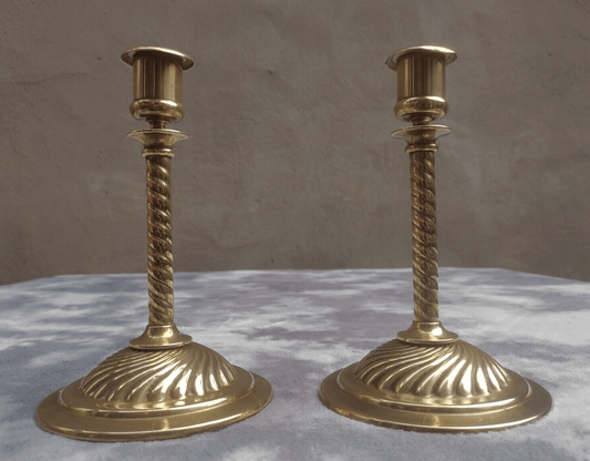 Antique Pair of Brass Spiral Swirl Twist Candlestick Holders - 18 cm