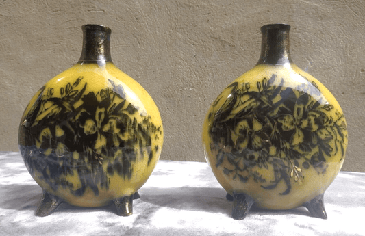 Antique Victorian Pair of Ceramic Iris Moon Flask Pottery Vases