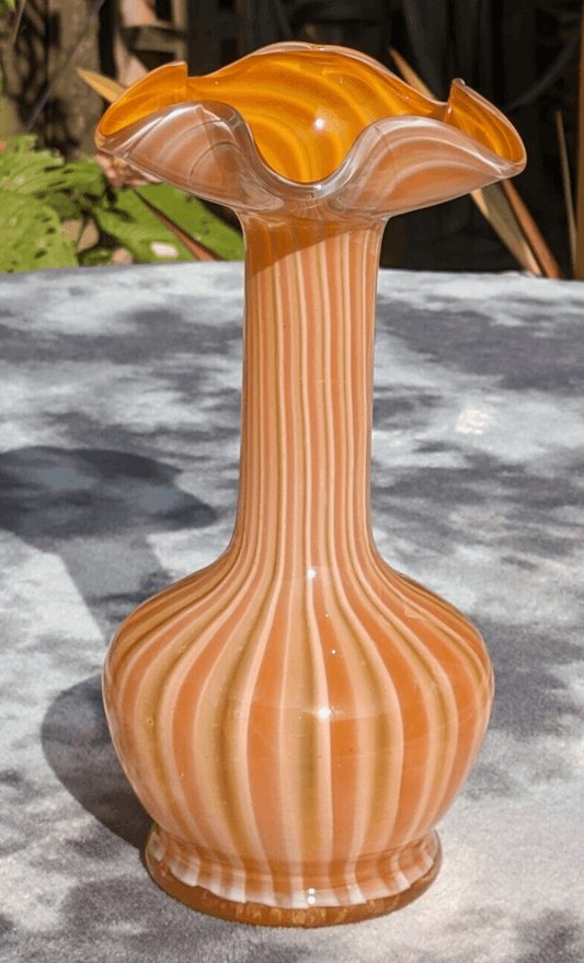 Vintage 1970s Mid Century Candy Striped Orange White Glass Vase - 23 cm