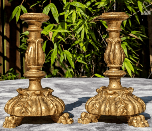 19th Century Pair French Carved Gilt Wood Claw Feet Antique Candlestick Holders