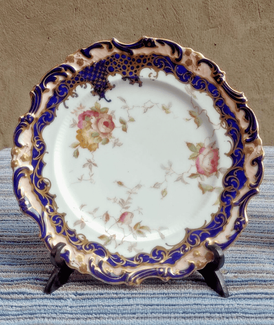 Antique 19th Century Pair Scalloped & Molded Cobalt Blue & Gilt Porcelain Plates