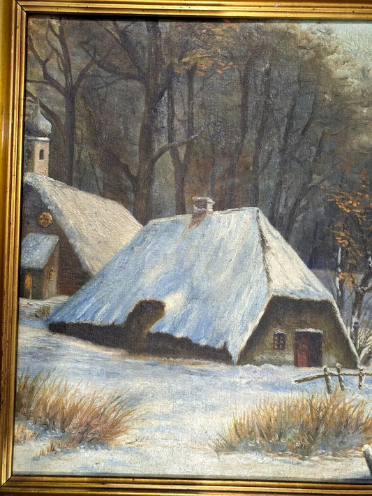 Antique 19th 20th Century Danish Oil Painting Winter Snow Cottage Barn Landscape