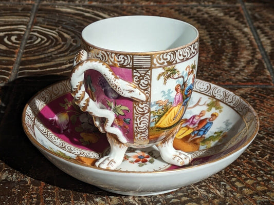 19th Century German Dresden Porcelain Paw Feet Serpent Handle Tea Cup & Saucer