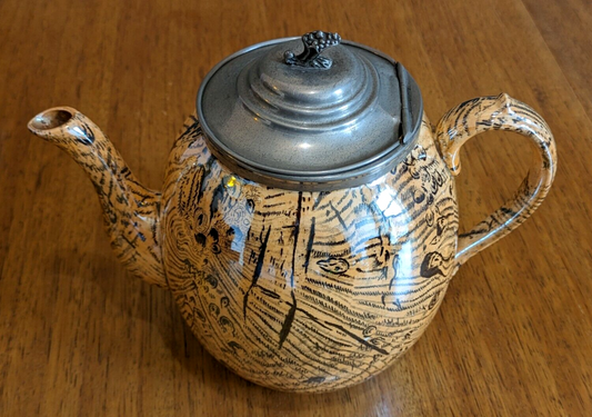 Antique Early 19th Century Staffordshire Transfer Slipware Ceramic Pewter Teapot