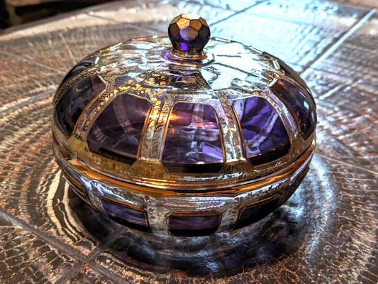 Antique 20th Century Moser Bohemian Czech Amethyst & Gold Art Glass Jar Dish Box