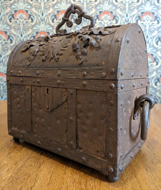 Large Antique Gothic German Medieval Style Wrought Iron Domed Casket Chest Box
