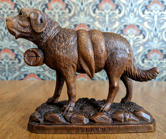 Swiss 19th Century Carved Linden Wood Black Forest St Bernard Dog Figure Antique