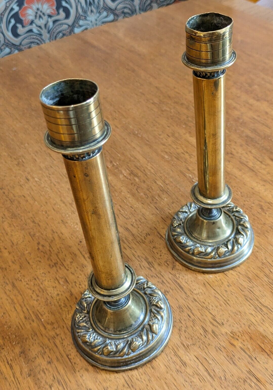 Pair of Arts & Crafts Brass Column Candlestick Holders Antique