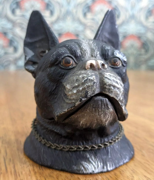 19th Century Cold Painted Spelter French Bull Dog Inkwell Collar Novelty Antique