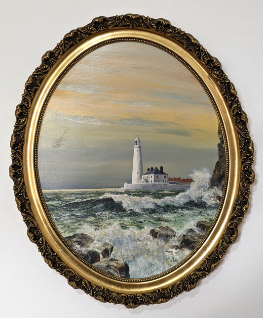 S White British 20th Century Oil Panel Art Painting St Mary's Island Lighthouse