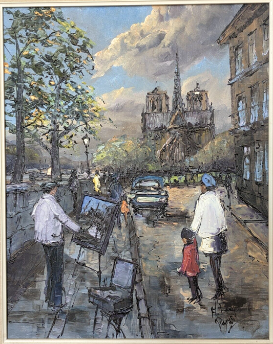 French Vintage 20th Century Paris Cityscape Oil Painting Art Notre Dame H Lang