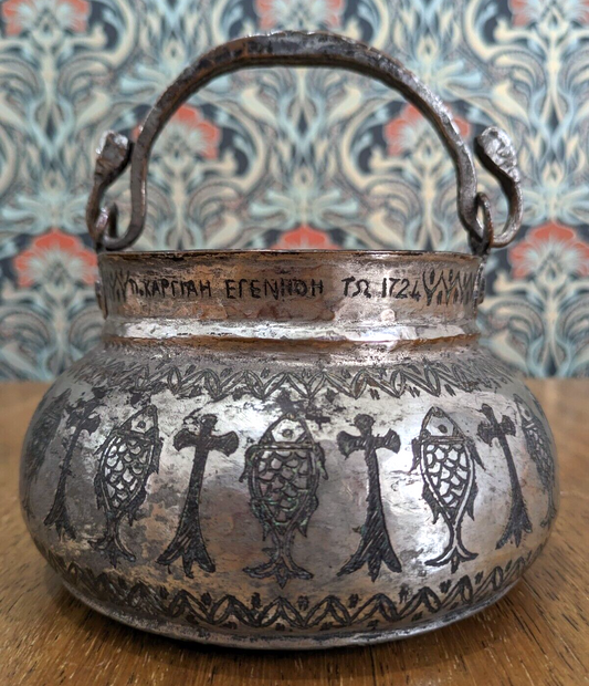 18th Century Ottoman Greek Engraved Fish Christian Tinned Copper Cauldron Pot