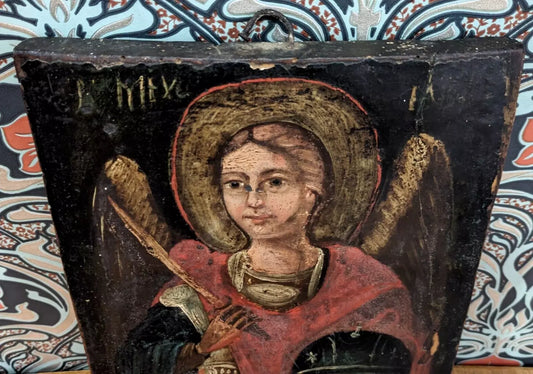 18 19th Century Oil Panel Archangel Michael Orthodox Religious Icon Painting Art
