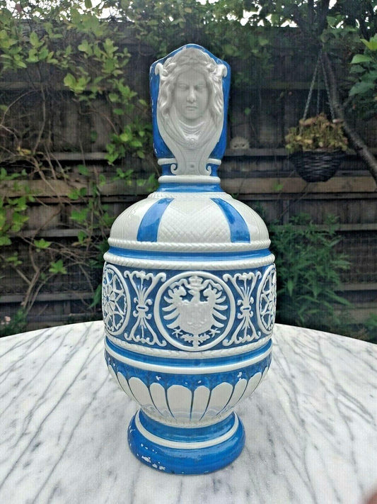 Blue & White Pottery Pitcher Jug Vase Masked Spout German Eagle Crest 14"
