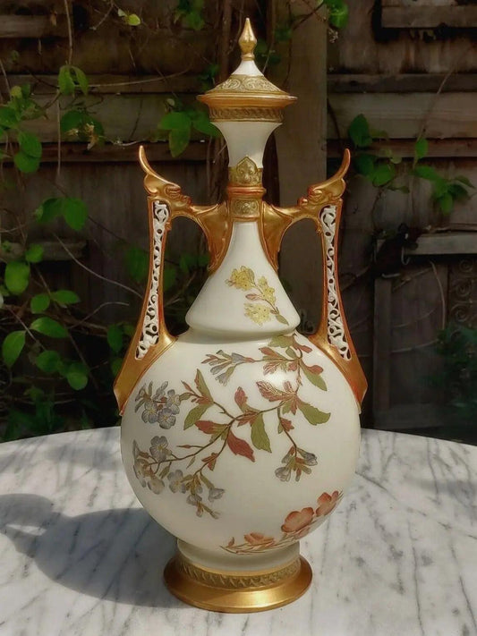 Large 1888 Aesthetic Movement Royal Worcester Ivory Vase & Cover Reticulated Dragon Handles