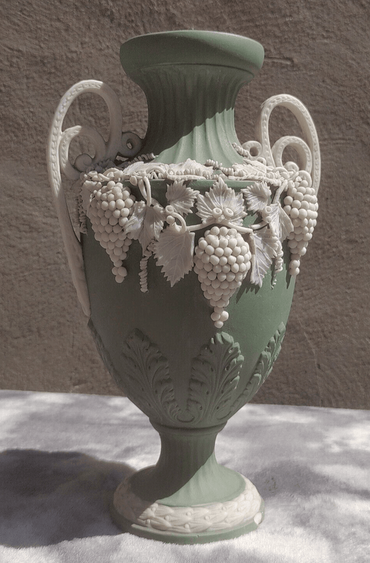 Victorian Antique Green Parian Jasperware Porcelain Vase med vinstokke & druer - 27 cm