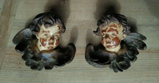 Antik par af tysk barokk Cherub Angel Putti Hovedpudsningsvæg Plaques