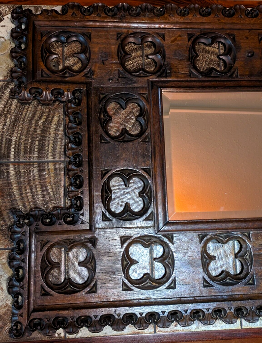 15th Century Gothic Carved Oak Wood Quatrefoil Tracery Panel Antique 19th Mirror