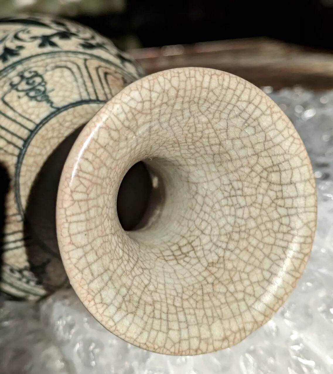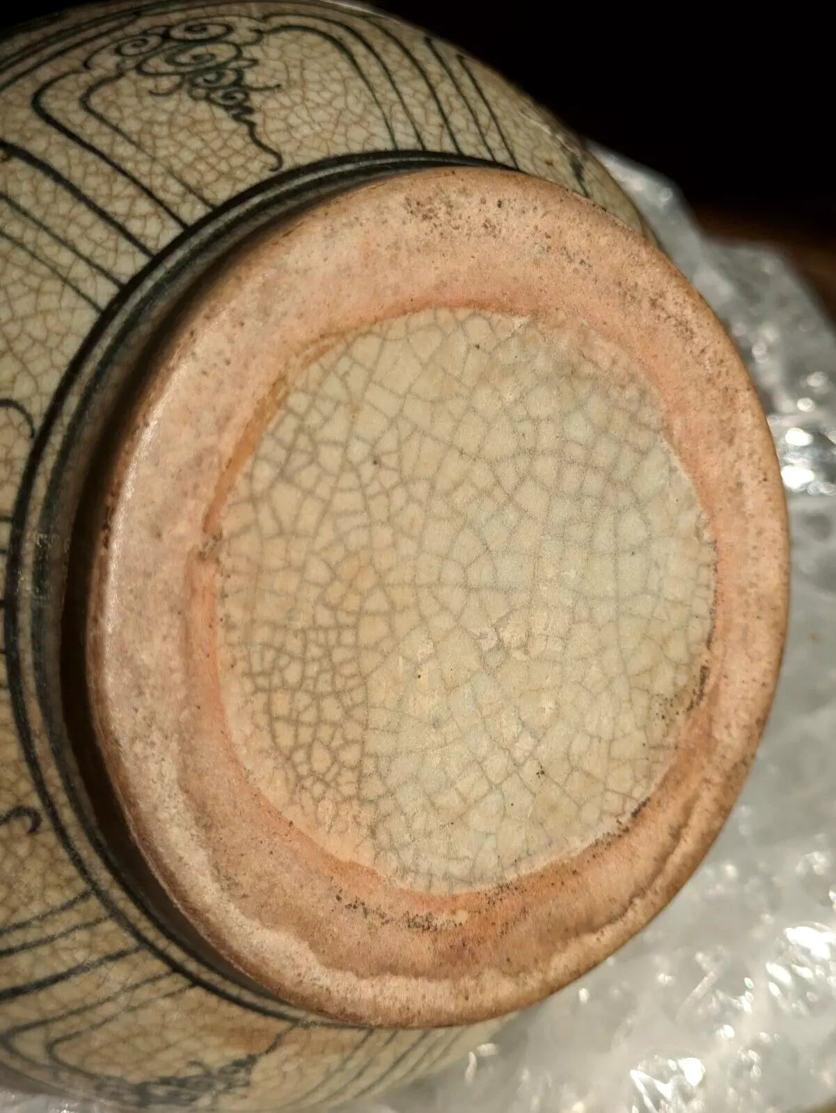 Possibly retrieved from shipwrecked cargo due to the discolouration on the glaze towards the base and on the underside.. as if the the bottom section has perhaps been exposed but somehow not the rest? It's worth noting that the amount of ceramics retrieved by the 15th century Hôi An shipwreck project which began in 1997 was colossal—some 250,000 pieces, and a further 50,000 pieces are estimated to have been haphazardly looted before the project began. I am not sure if the markings correspond with the way shipwrecked can be affected.
