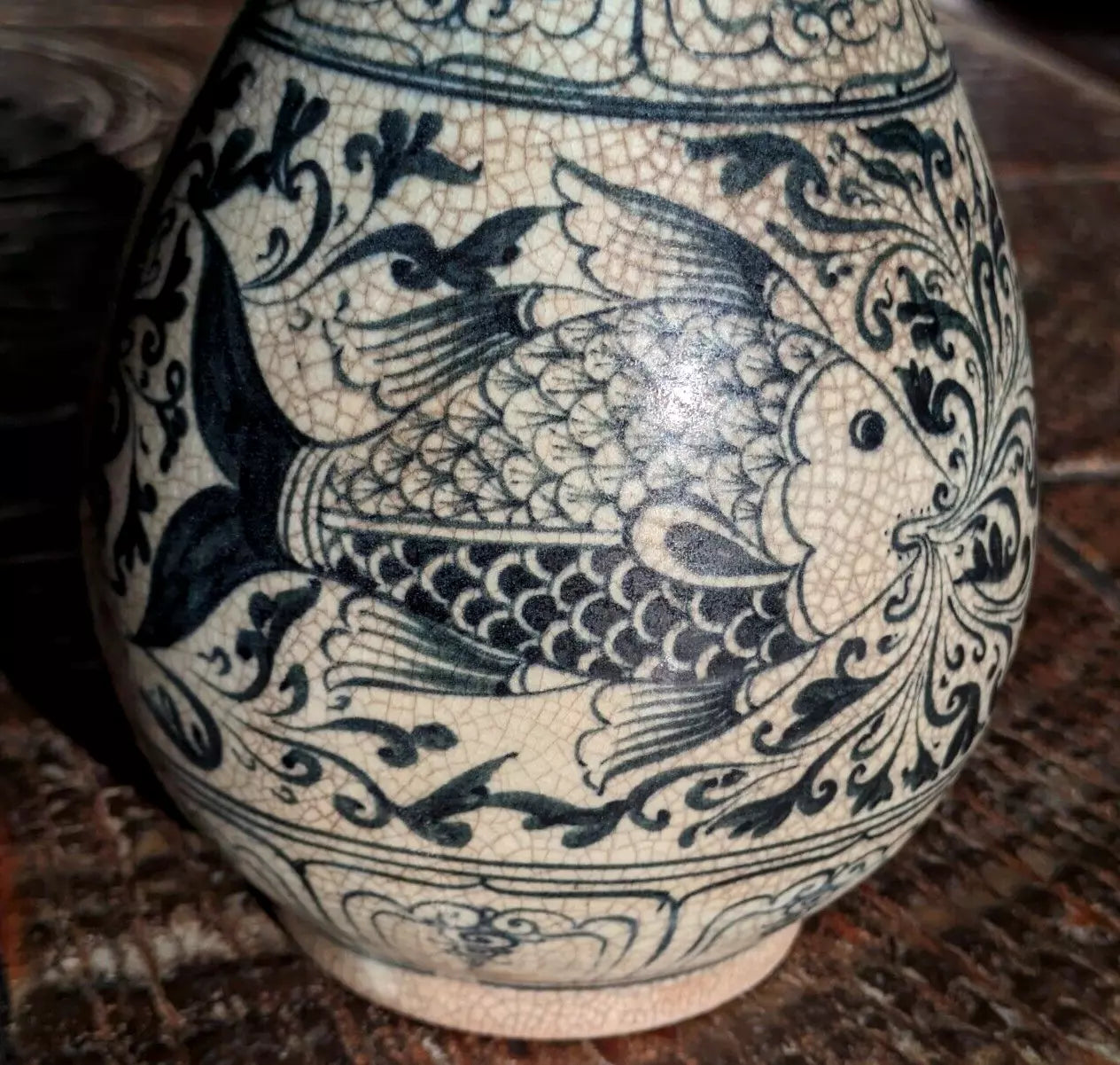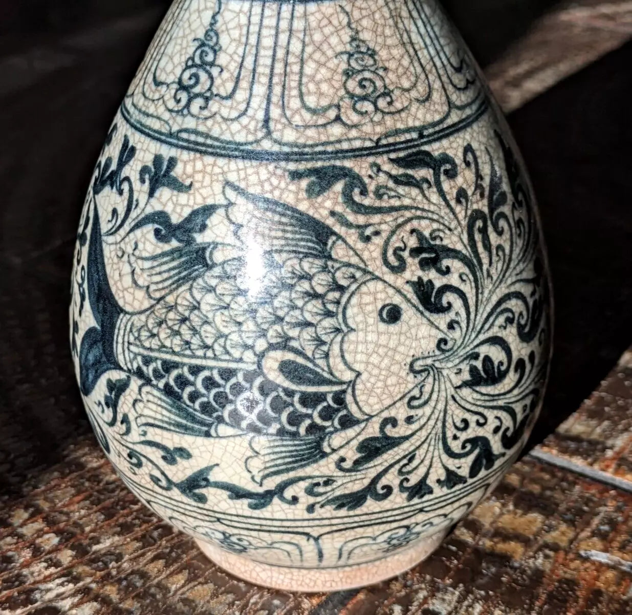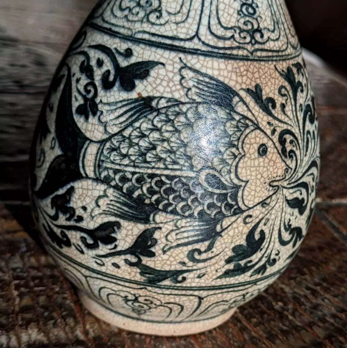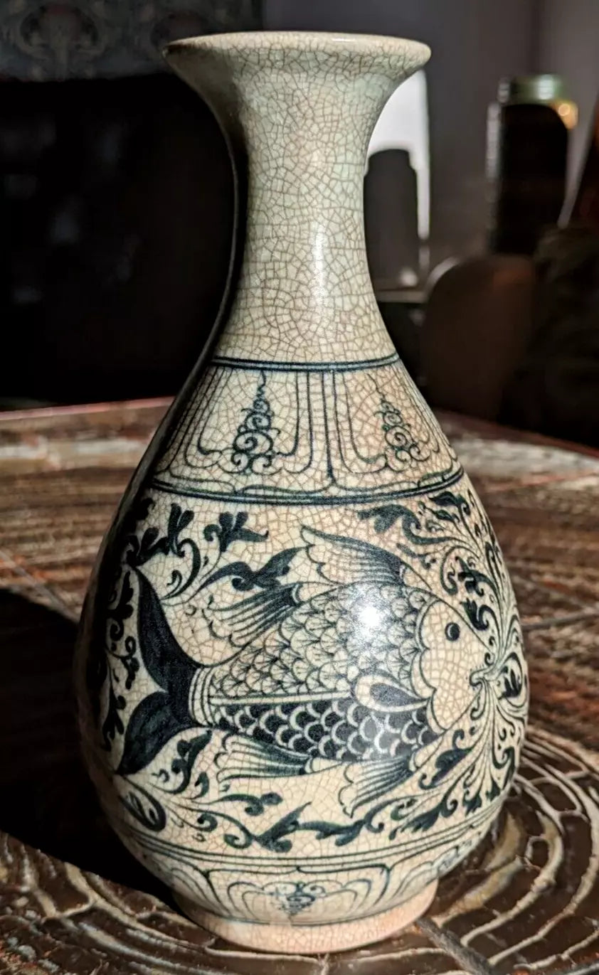 A superb piece of Vietnamese / Annamese ceramic porcelain in the form of a pear shaped vase with stunning detail depicting two fish and decorative panelled bands.