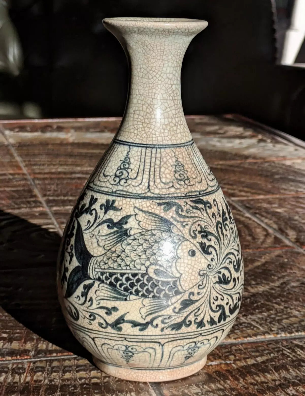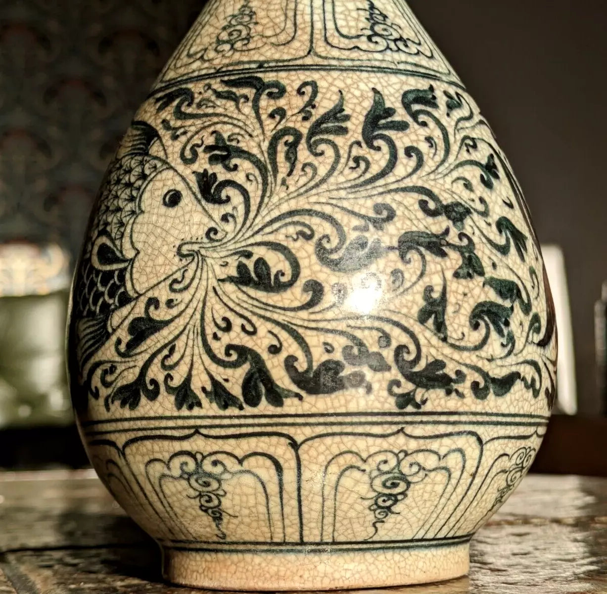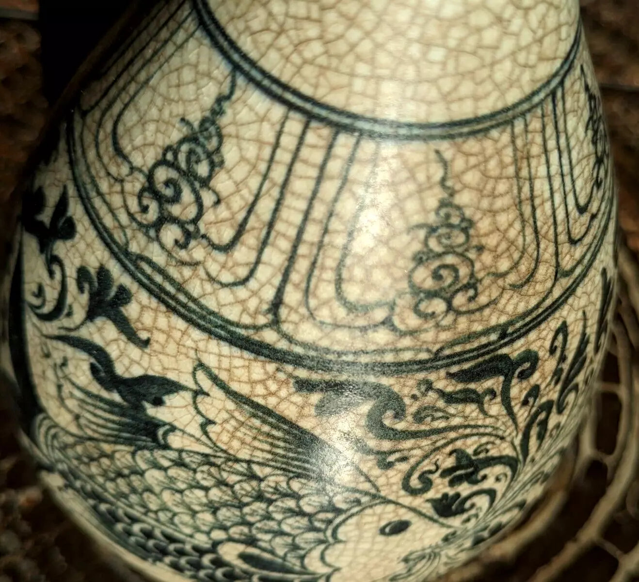 A superb piece of Vietnamese / Annamese ceramic porcelain in the form of a pear shaped vase with stunning detail depicting two fish and decorative panelled bands.