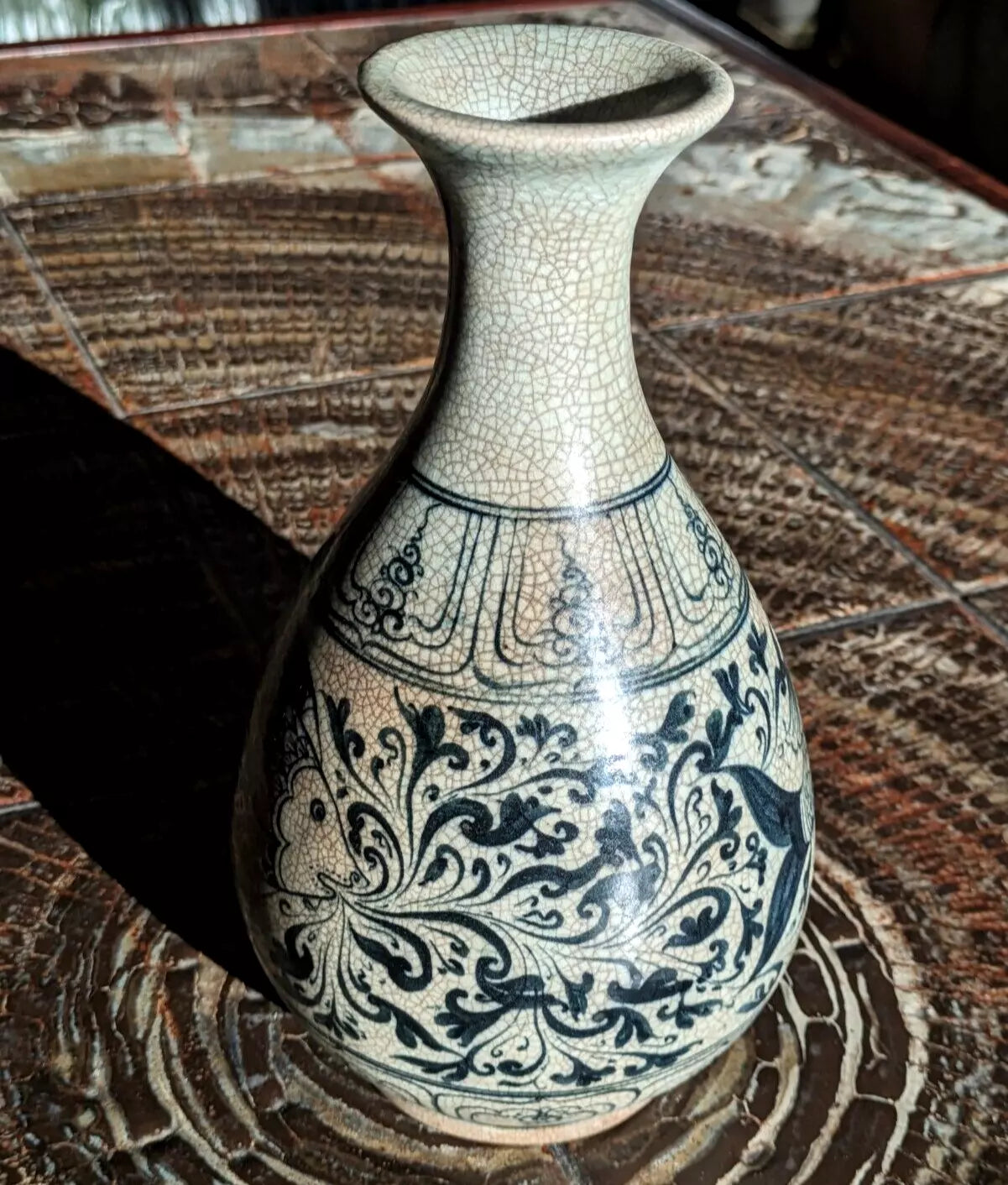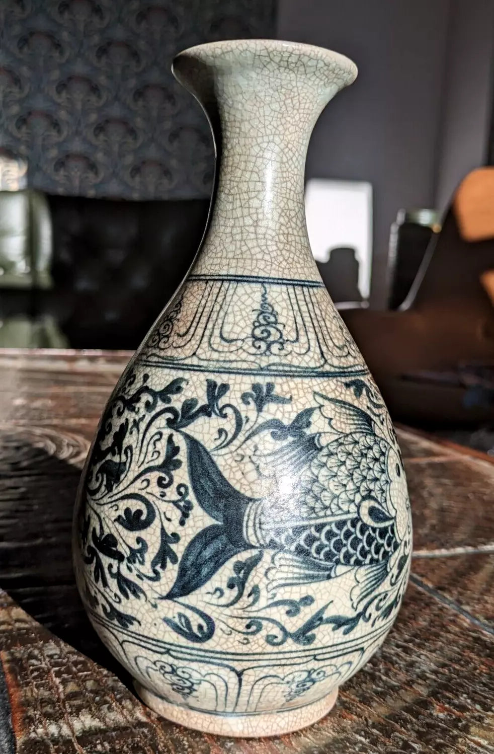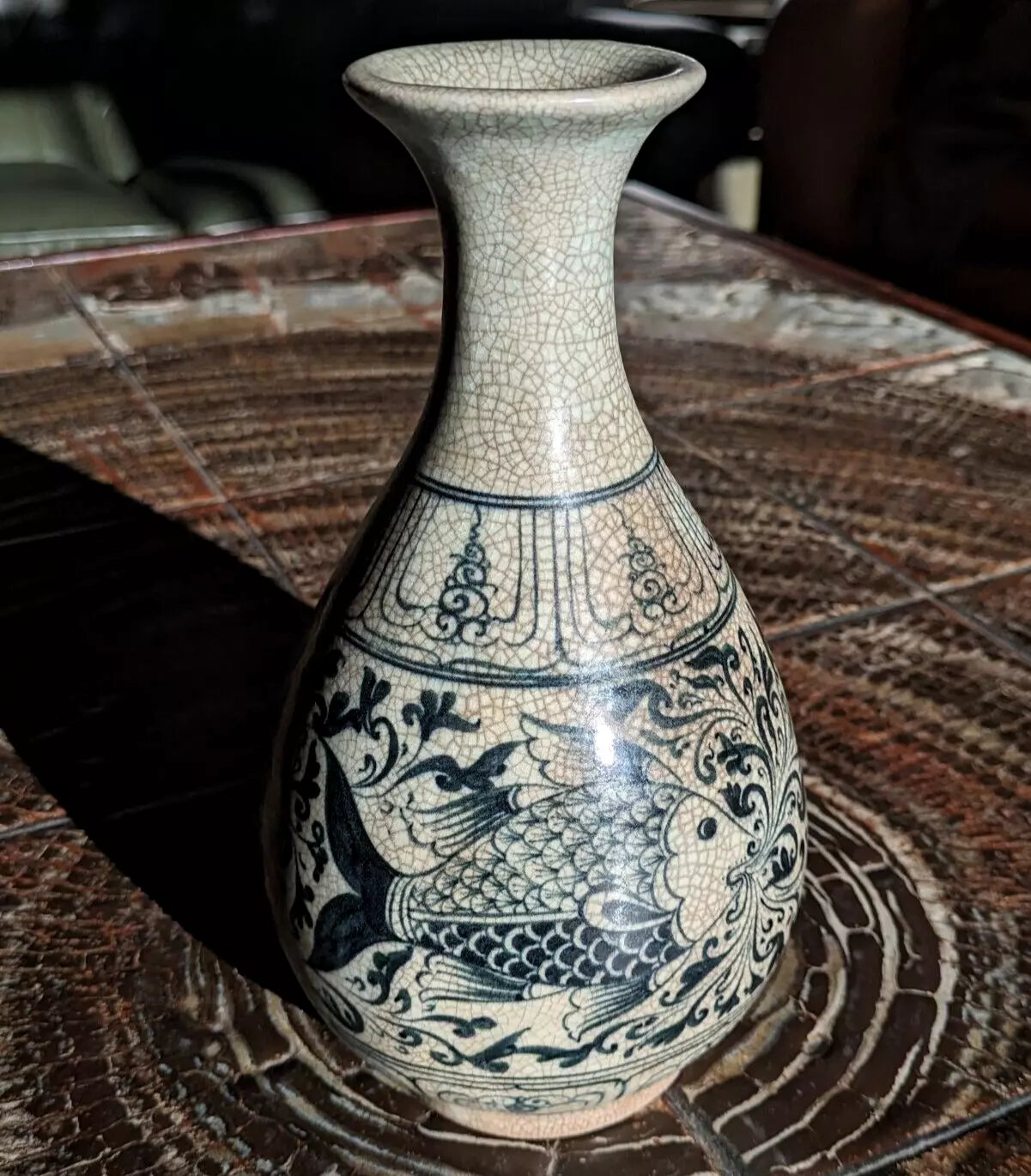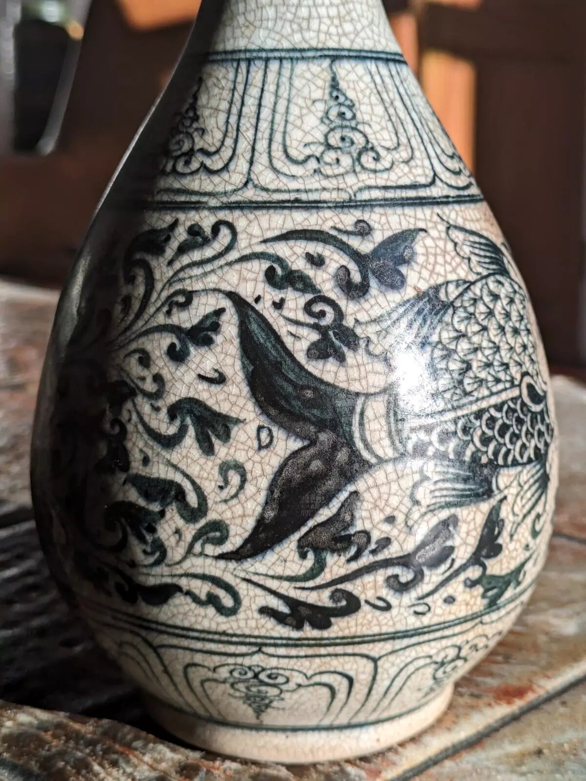 A superb piece of Vietnamese / Annamese ceramic porcelain in the form of a pear shaped vase with stunning detail depicting two fish and decorative panelled bands.