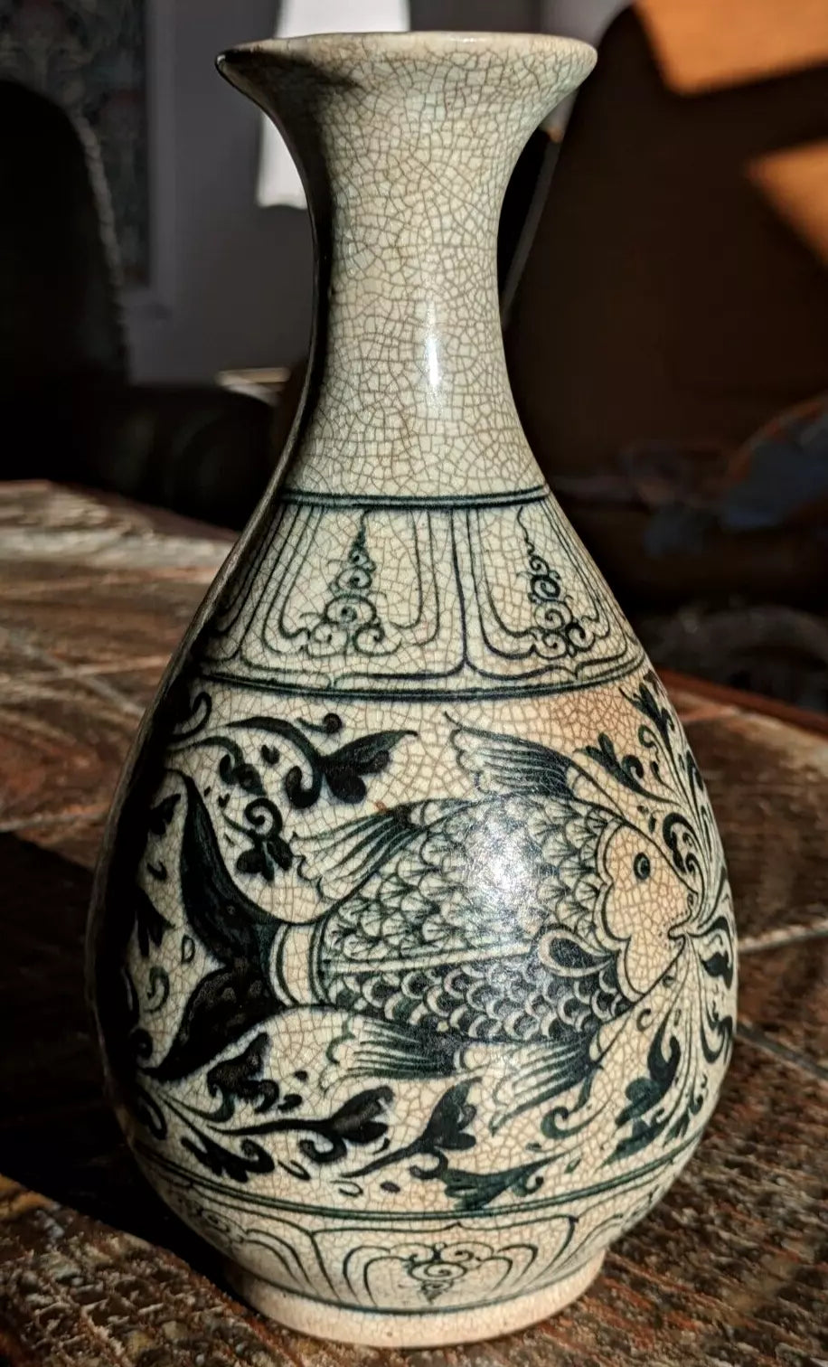 15th / 16th Century Vietnamese Annamese Blue & White Fish Vase Ceramic Porcelain
