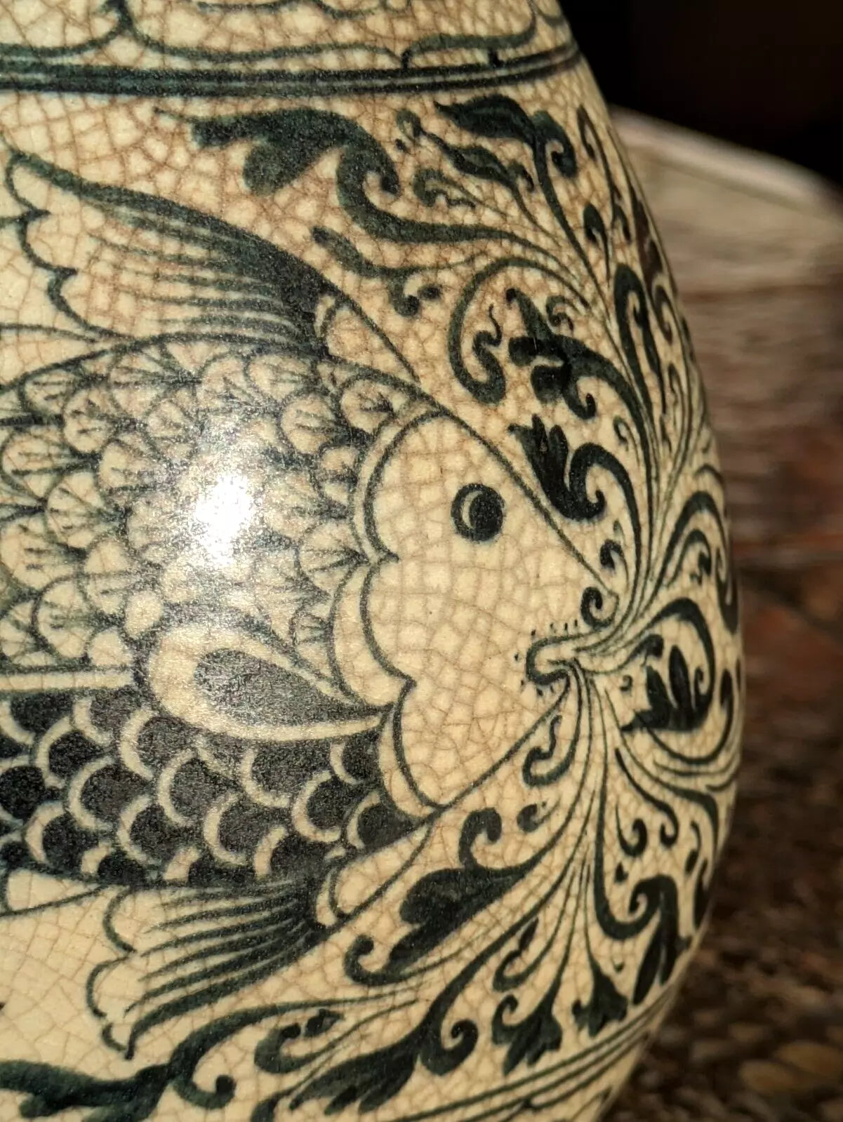 Produced 15th / 16th century this is a very fine piece of Annamese pottery that is particularly well-detailed with a fantastic flow and sense of movement to the scrolling design coming from the fish.