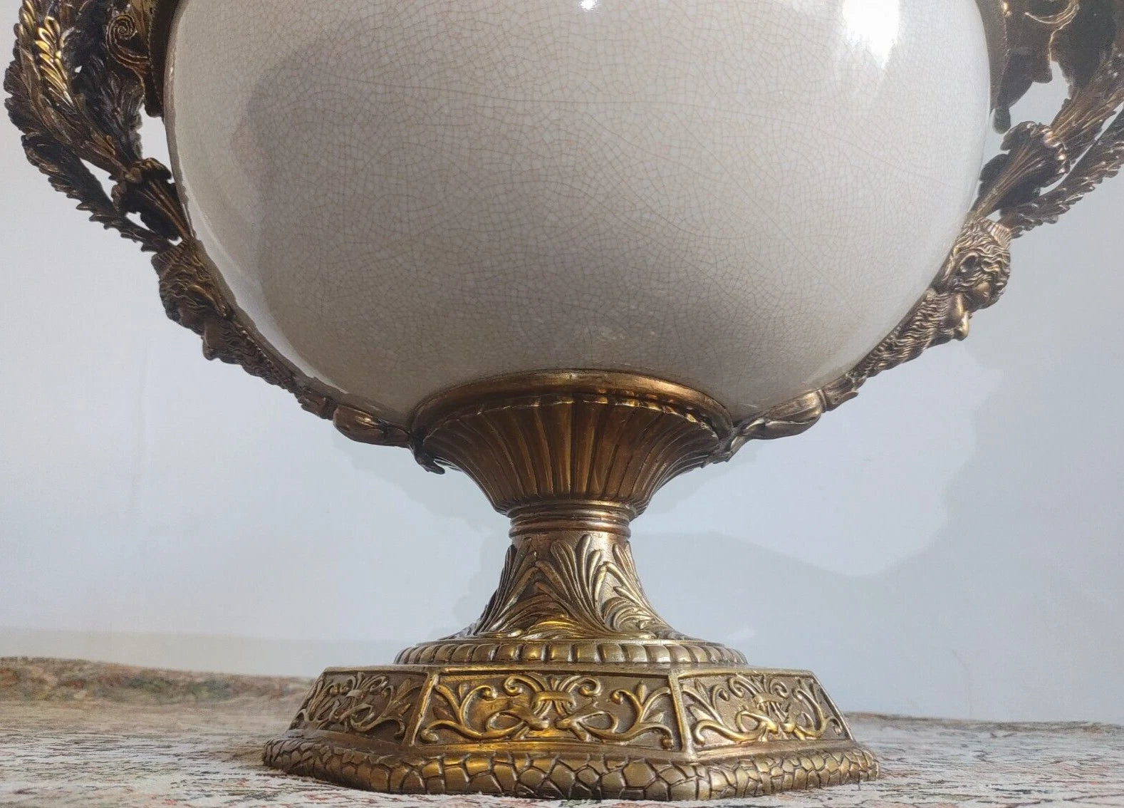White crackle glaze ceramic bowl with ornate brass metalwork foliage handles and neoclassical god mascarons stood upon a decoratively patterned pedestal base.
