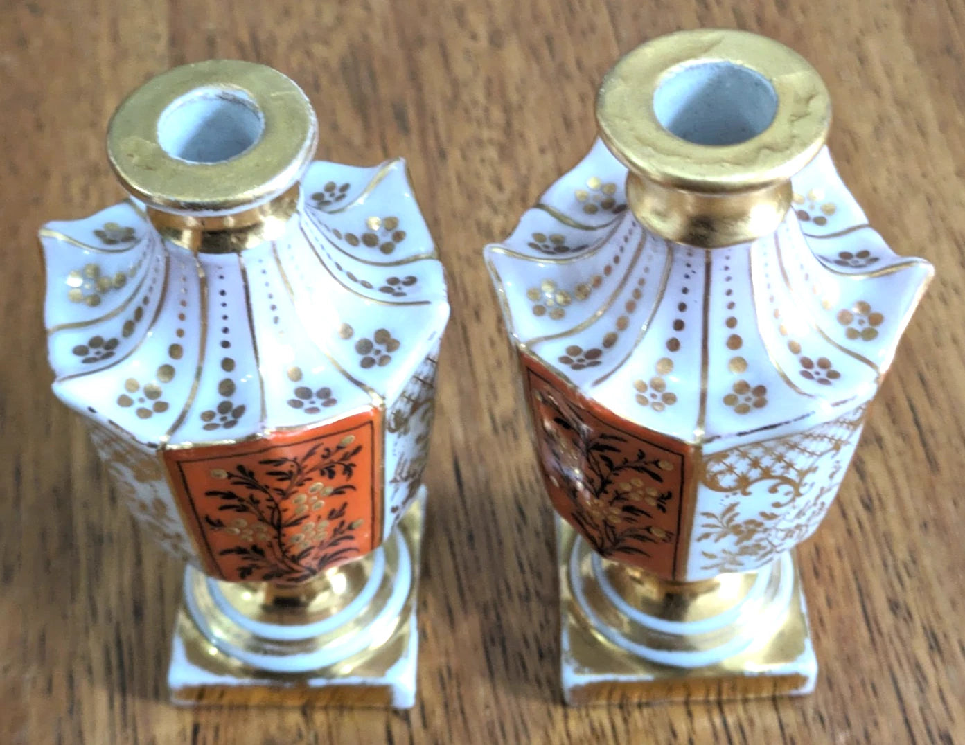 A pair of French 19th century porcelain scent bottles / bud vases featuring a distinctive form with scalloped shoulders and decorated in a white, orange, light pink, and gold palette with square pedestal bases.
